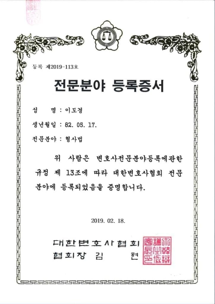 Due to the huge number of criminal cases where attorney Simon D. Lee demonstrated an outstanding performance and exceptionally good results, in 2019 he was officially registered as an expert attorney in criminal law at the Korean Bar Association, an honor given to those who proved themselves highly professional in their area of work and who contributed to the community of lawyers by increasing public confidence in the professionalism of Korean attorneys. Congratulations, Mr. Lee!!!